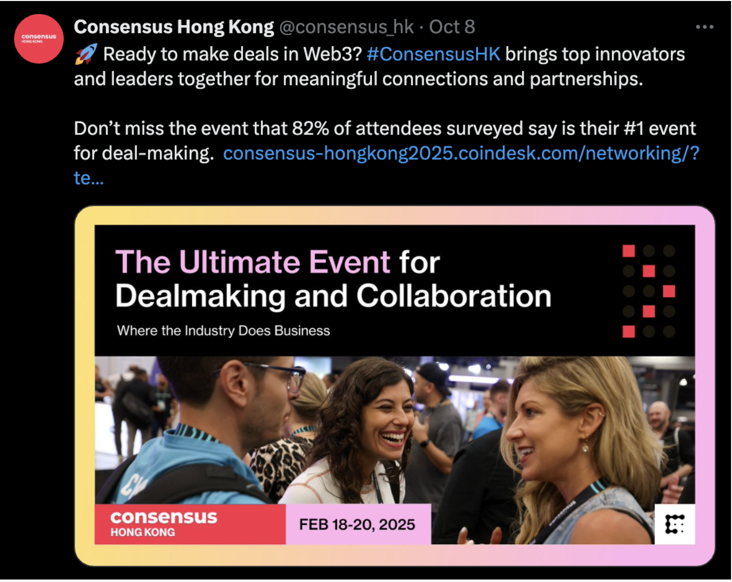 Over three years at CoinDesk, I helped drive 48% above-target attendee revenue and a 300% increase in in-person attendance at Consensus. What started as a North American crypto conference became a global event, with the launch of Consensus Hong Kong 2025 marking a new chapter for the world's most important gathering in crypto.